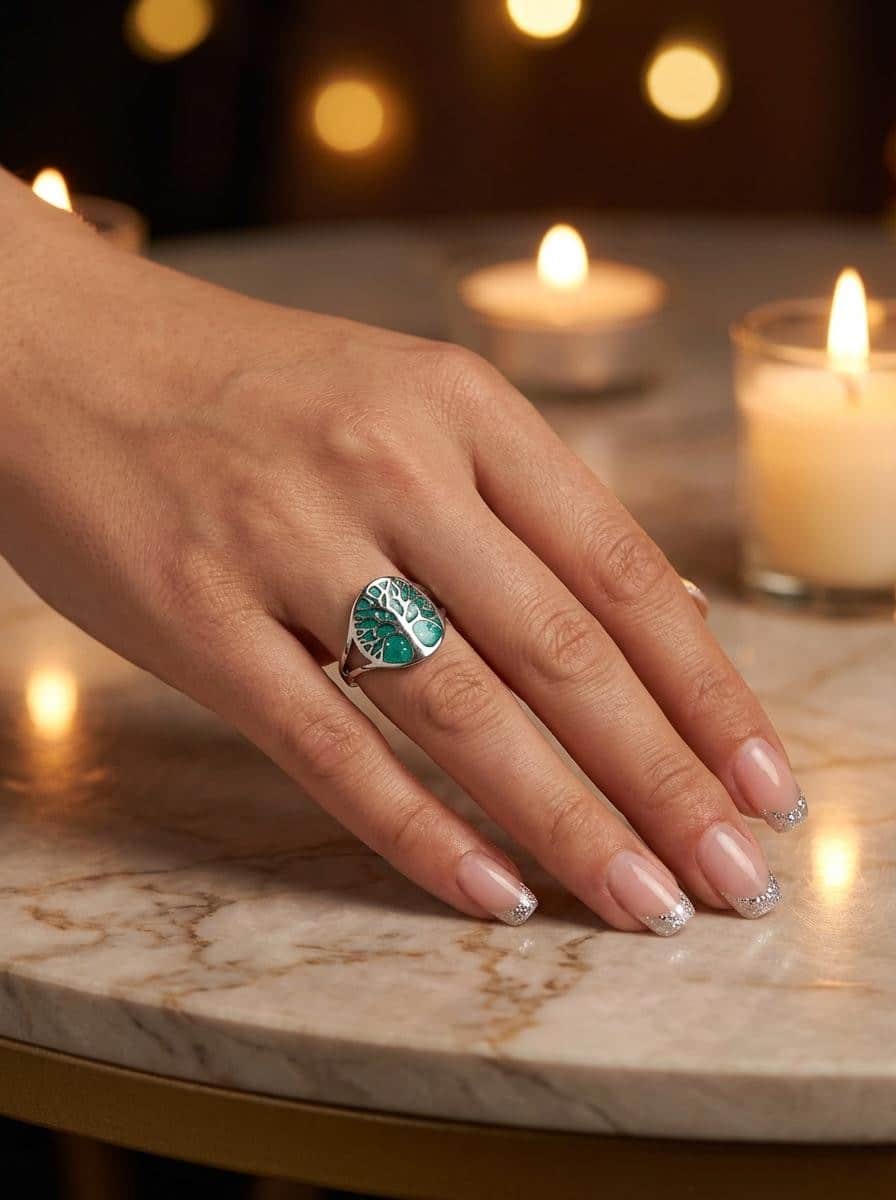 Chaque bague Arbre de Lumière verte pailletée est conçue avec un fond en résine pailletée qui capte la lumière et renforce l’effet scintillant du motif arbre de vie.