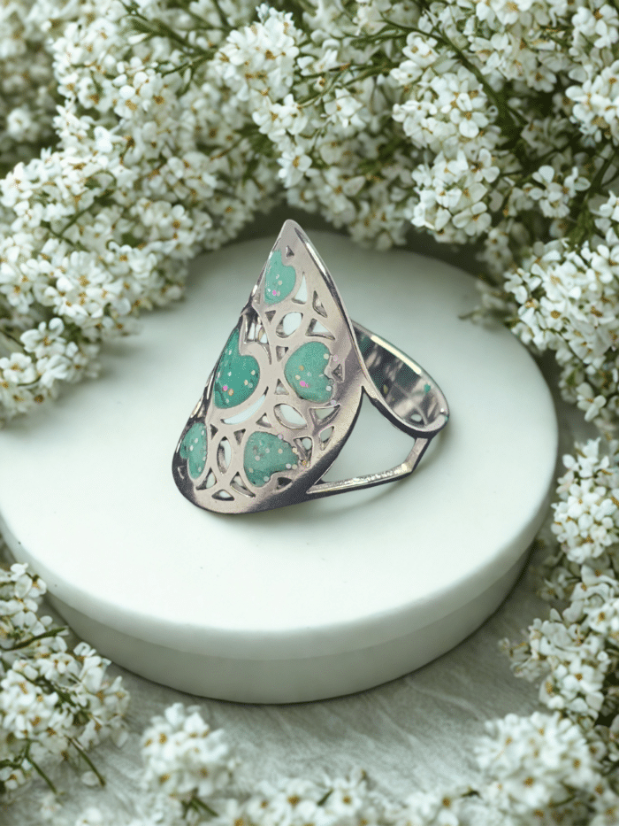 La bague Cœur en Lumière verte pailletée « Cœur Florissant » s’inspire du symbole universel du cœur, représentant l’amour et la connexion intérieure. Son fond en résine pailletée capte la lumière et met en valeur le motif cœur.