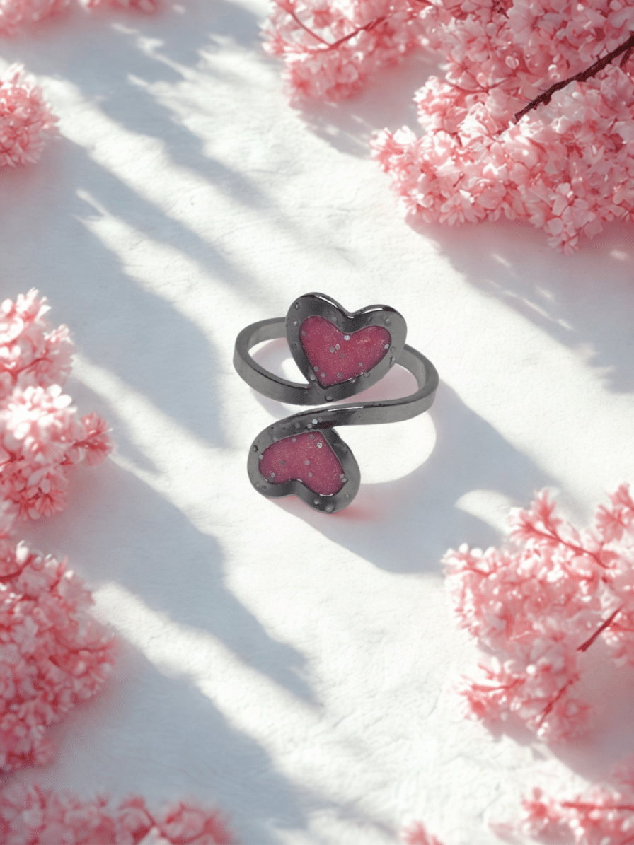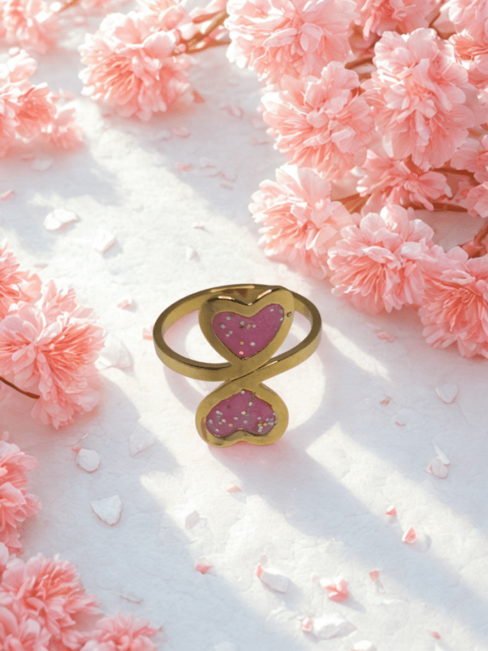 La bague duo Cœur en Lumière rose pailleté « Double Tendresse » s’inspire du symbole universel du cœur, représentant l’amour et la connexion intérieure. Ses deux cœurs en résine pailletée captent la lumière et créent un rendu scintillant unique.