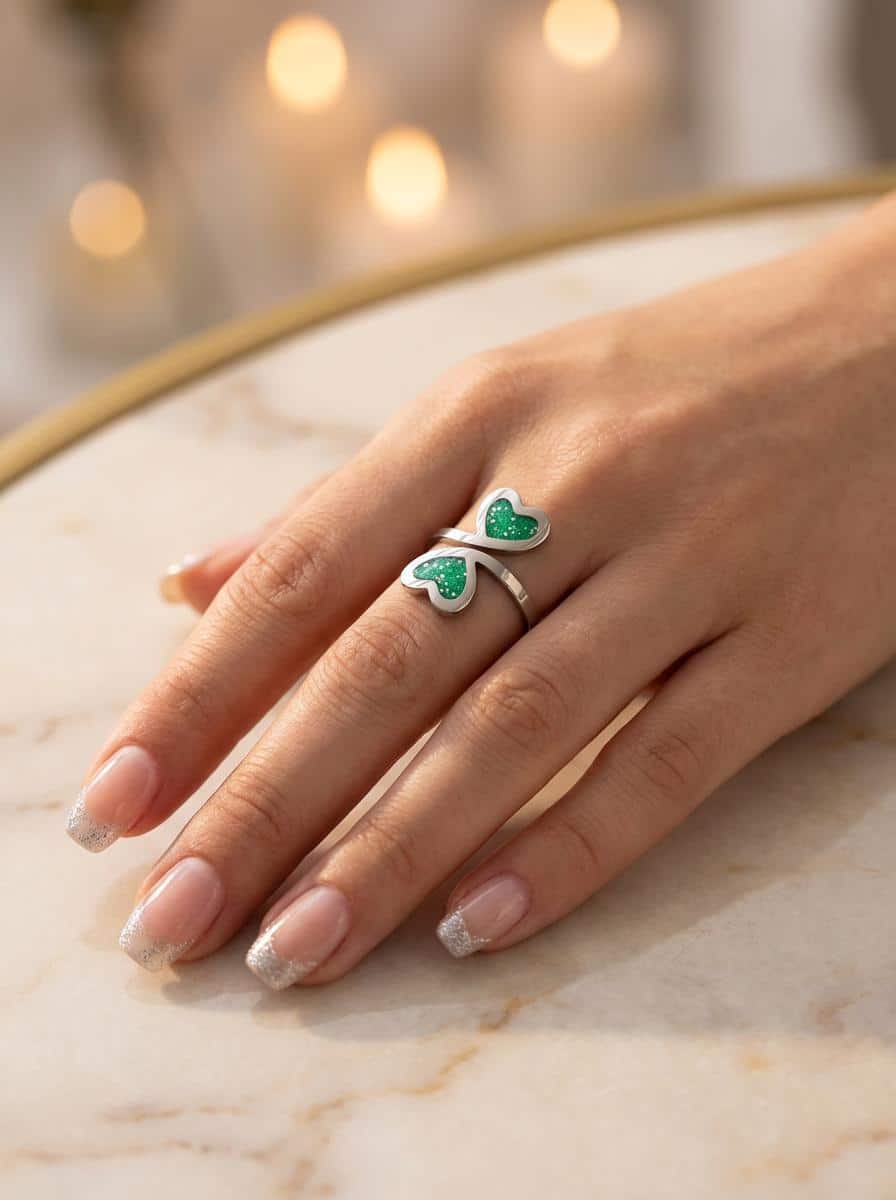 Bague duo Cœur en Lumière vert pailleté, symbole d’amour et d’harmonie intérieure.