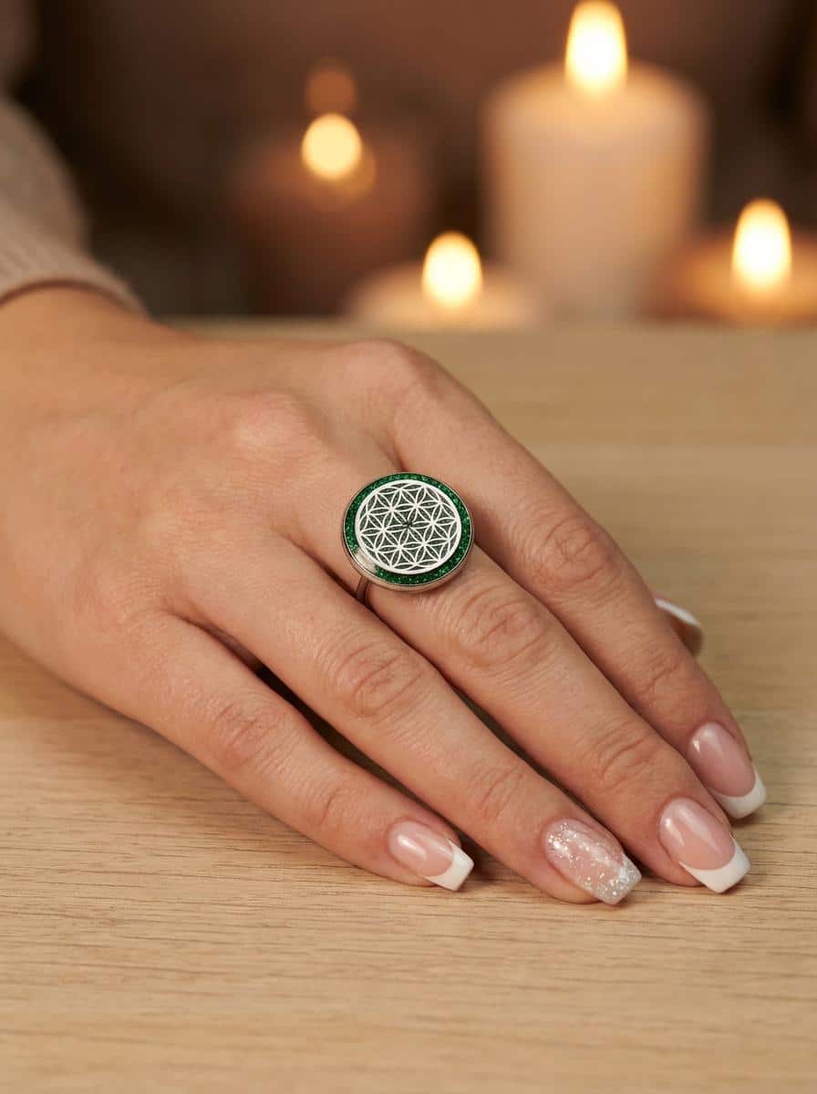La Fleur de Vie est un symbole géométrique ancien présent dans plusieurs traditions. Elle est souvent associée à l’harmonie, à l’équilibre et à la cohérence intérieure. Sur cette bague, le contraste entre l’acier et le vert crée un effet lumineux affirmé.