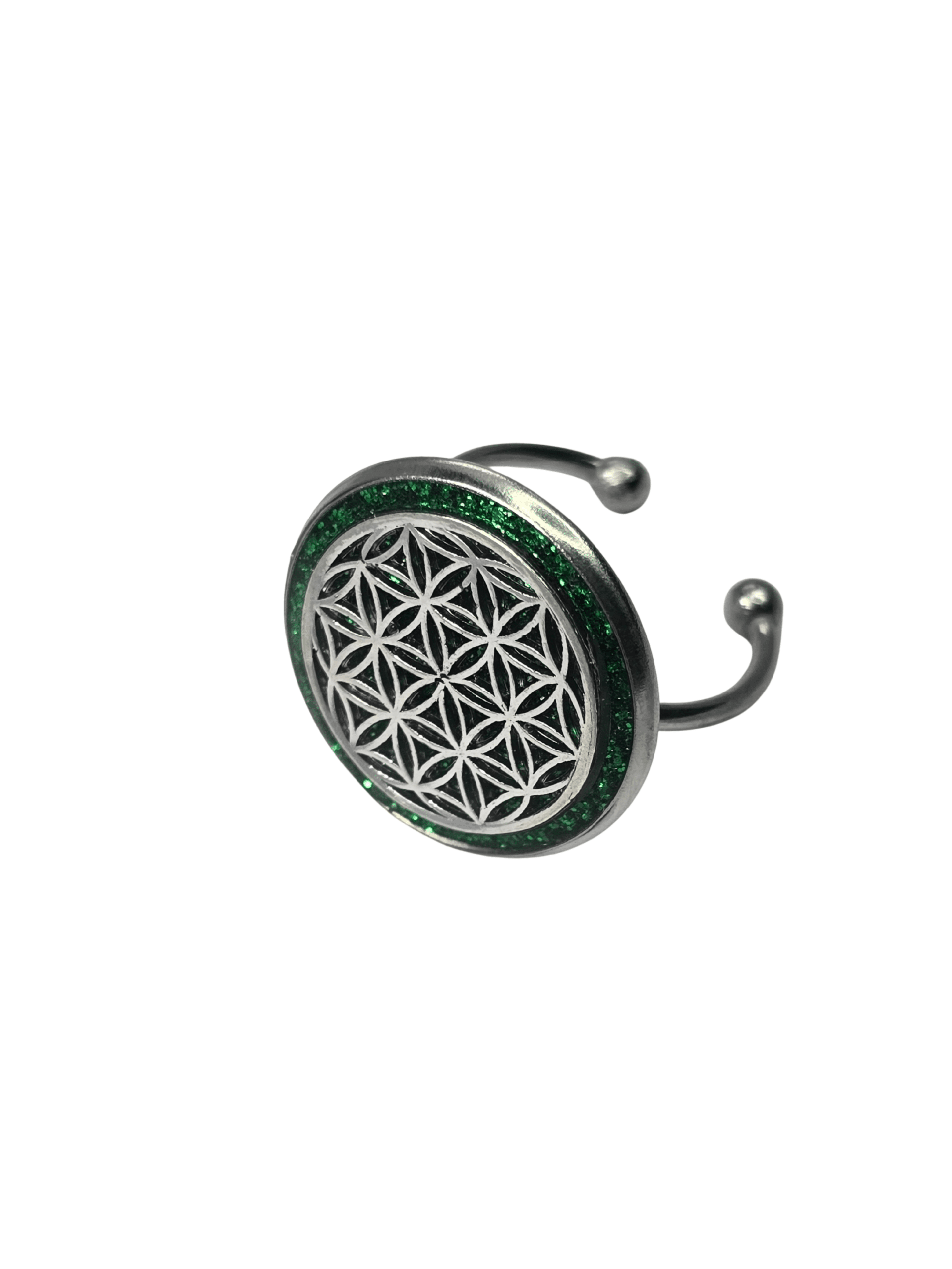 Bague Fleur de Vie Verte « Souffle Vert » en acier inoxydable, ajustable, disponible en finition argentée ou dorée. Motif rond avec résine verte pailletée pour un éclat lumineux et profond.