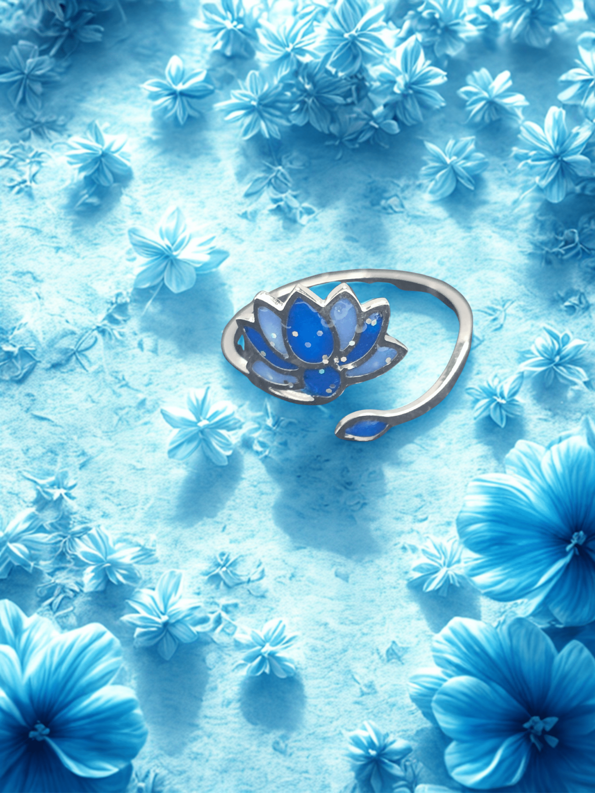 La bague Lotus Sacré bleue pailletée « Lotus Céleste » s’inspire de la fleur de lotus, symbole universel de pureté et d’éveil spirituel. Son fond en résine pailletée capte la lumière et met en valeur le motif lotus.