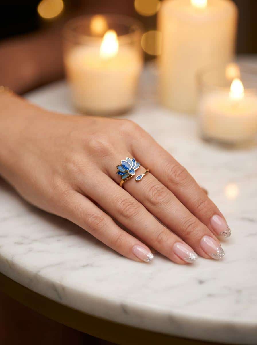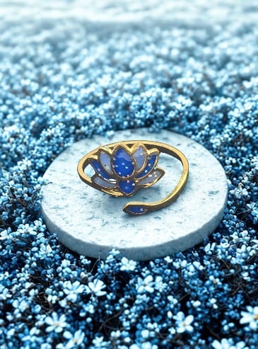 La bague Lotus Sacré bleue pailletée « Lotus Céleste » apporte une touche lumineuse et apaisante, facile à associer à toutes les tenues.