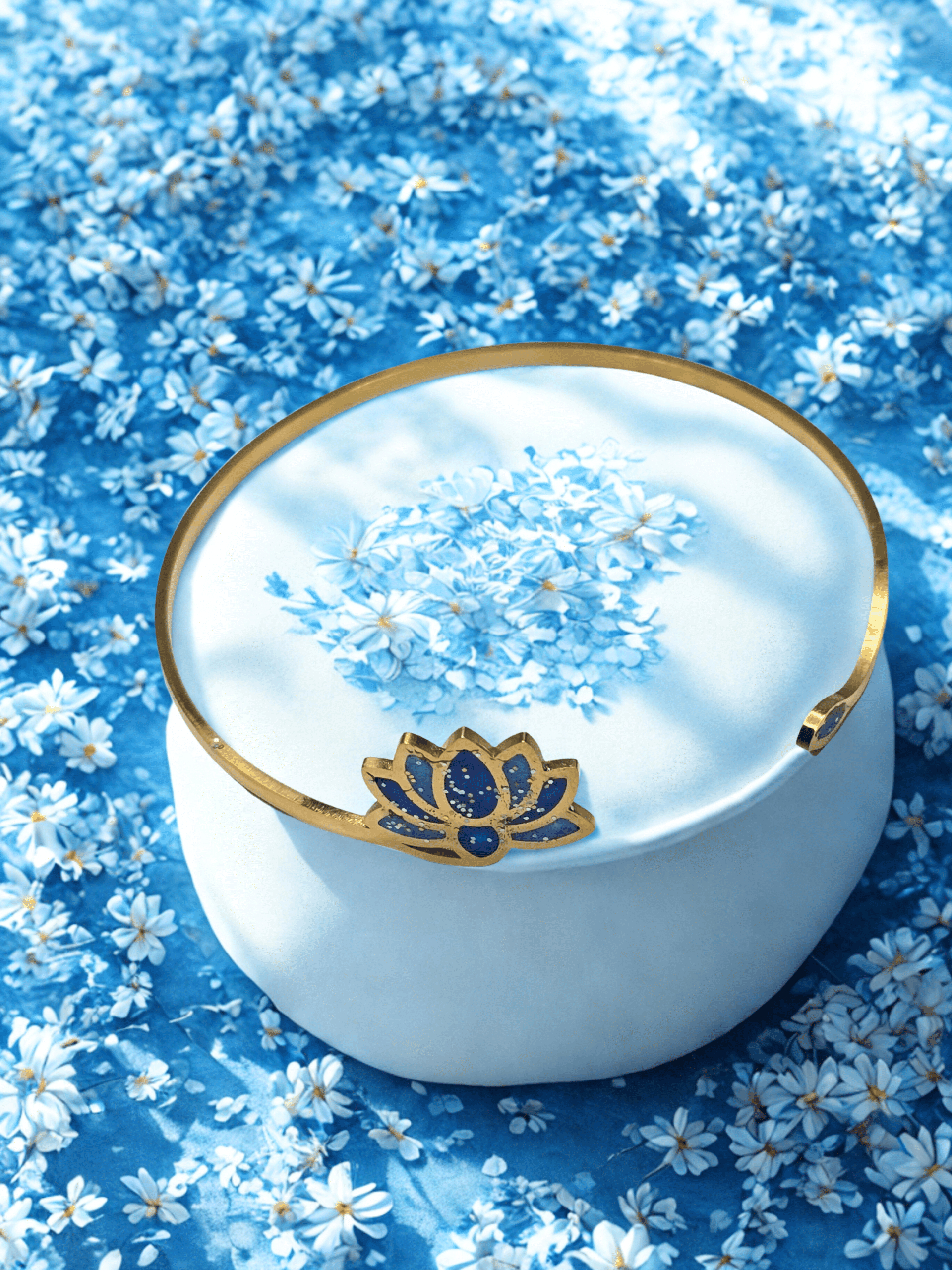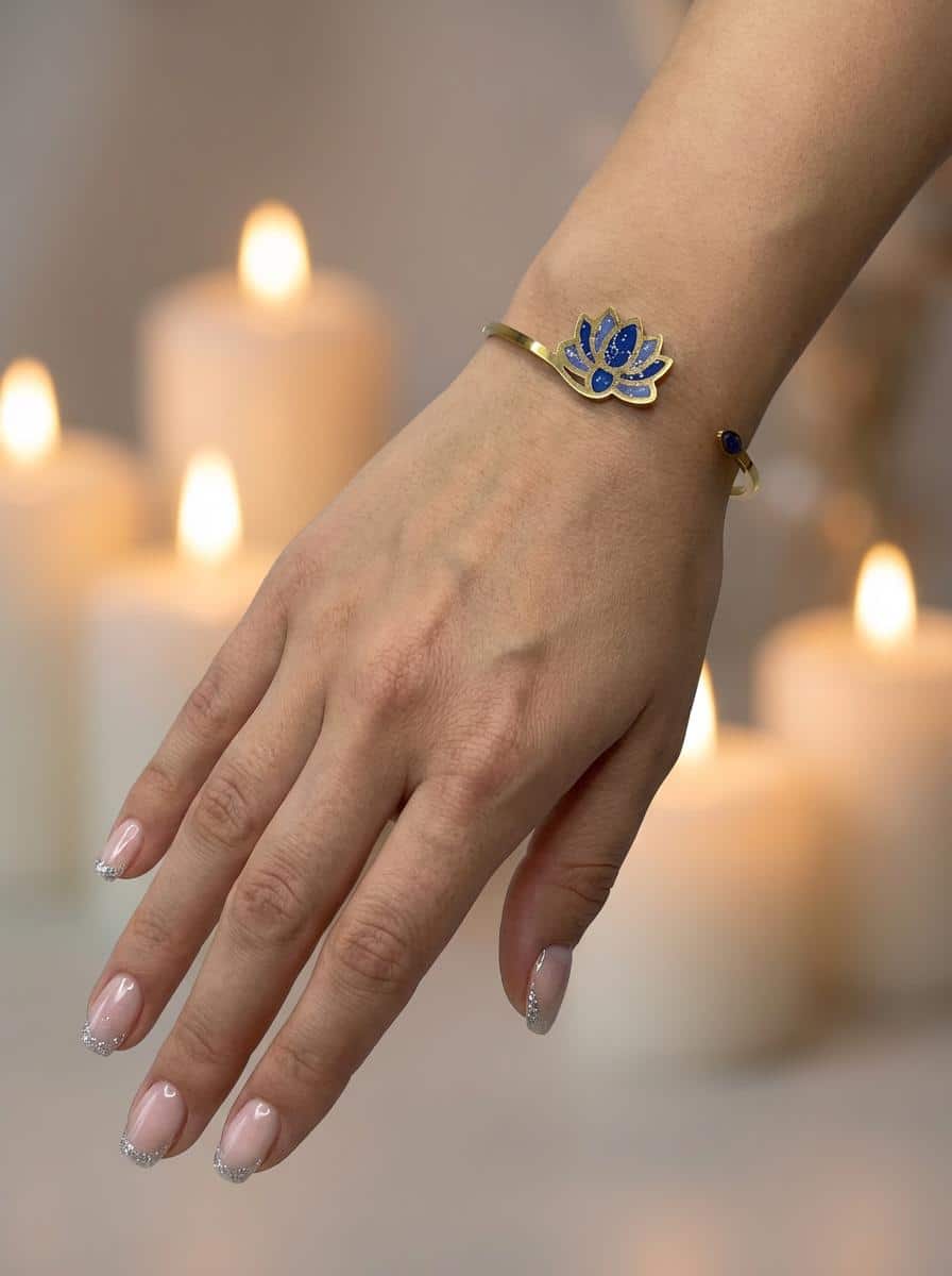 Le bracelet Lotus Sacré bleu pailleté « Onde Sacrée » s’inspire de la fleur de lotus, symbole universel de pureté et d’éveil spirituel. Son fond en résine pailletée capte la lumière et met en valeur le motif lotus.