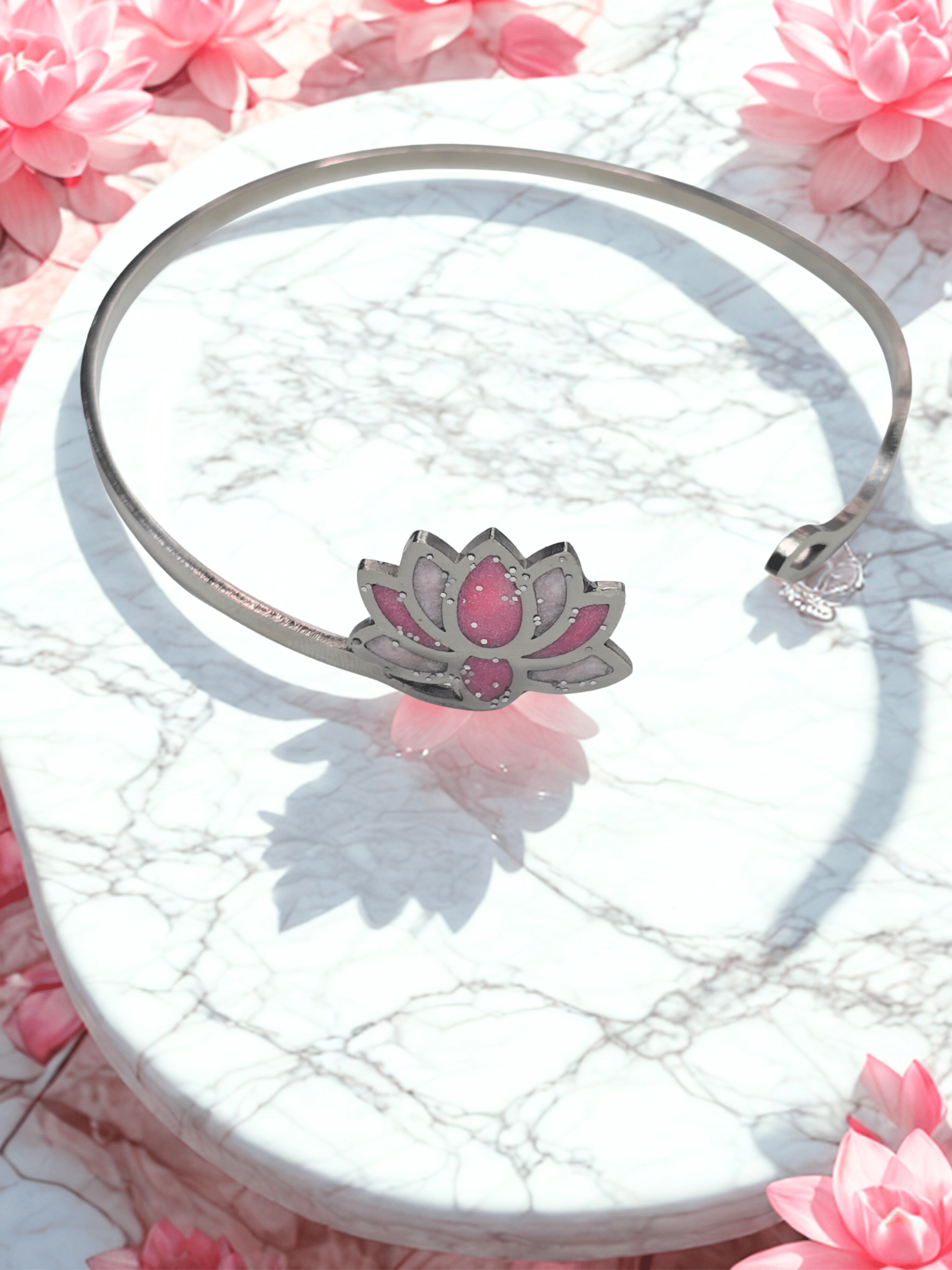 Le bracelet Lotus Sacré rose pailleté « Pétale Divin » apporte une touche lumineuse et délicate, facile à associer à toutes les tenues.