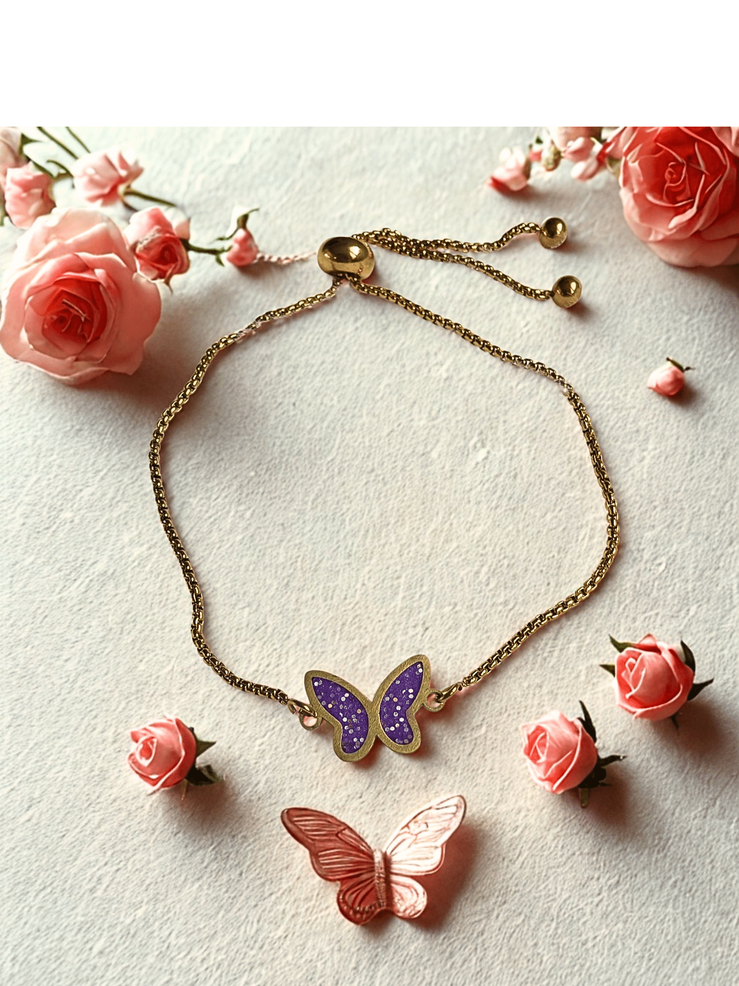 Chaque bracelet Papillon Éternel violet pailleté est conçu avec un fond en résine pailletée qui capte la lumière et renforce l’effet scintillant des ailes.