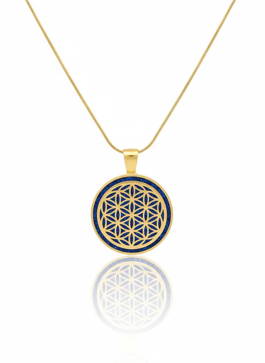 Collier Fleur de Vie bleu « Rayonnement Intérieur » en acier inoxydable, sublimé par un fond bleu pailleté et disponible en finition argentée ou dorée.