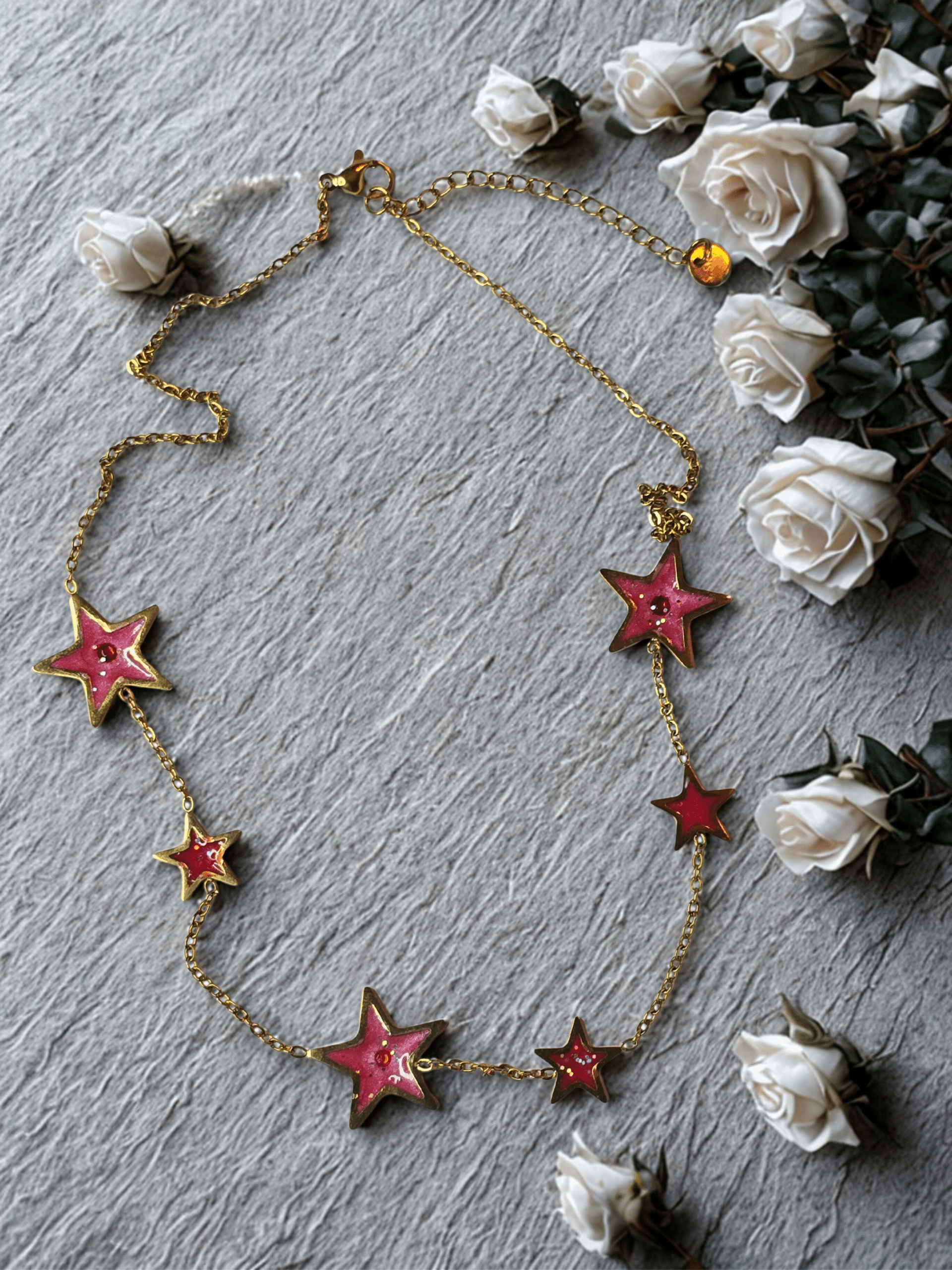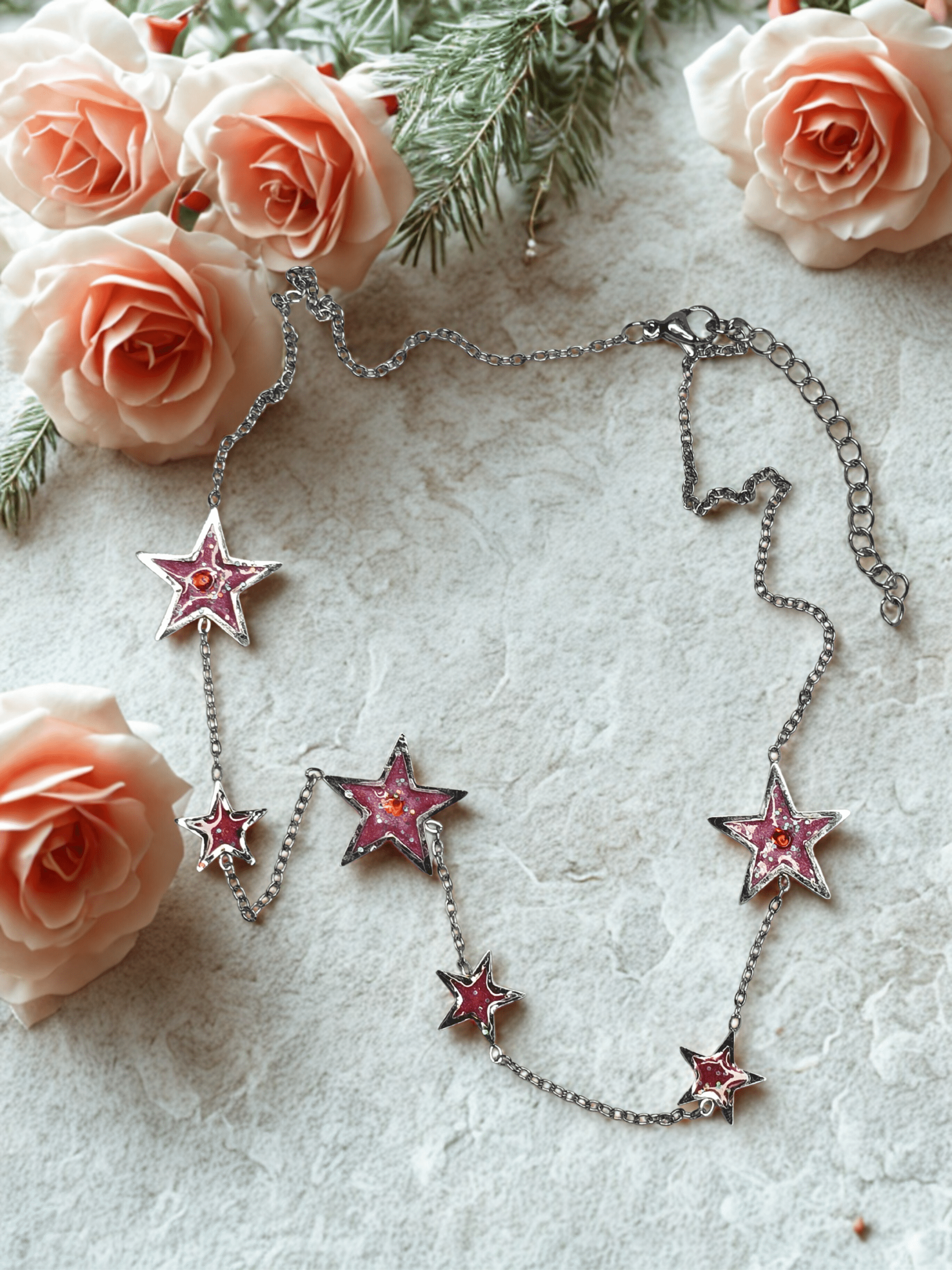 Chaque collier Univers Étoilé rouge pailleté est conçu avec un fond en résine pailletée.