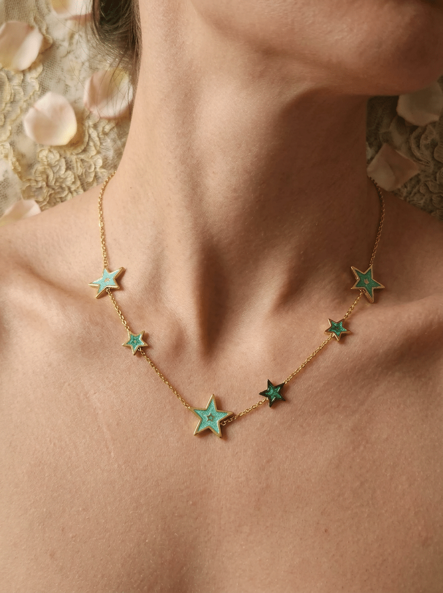Le collier Univers Étoilé vert pailleté « Souffle Astral » s’intègre facilement à toutes les tenues.