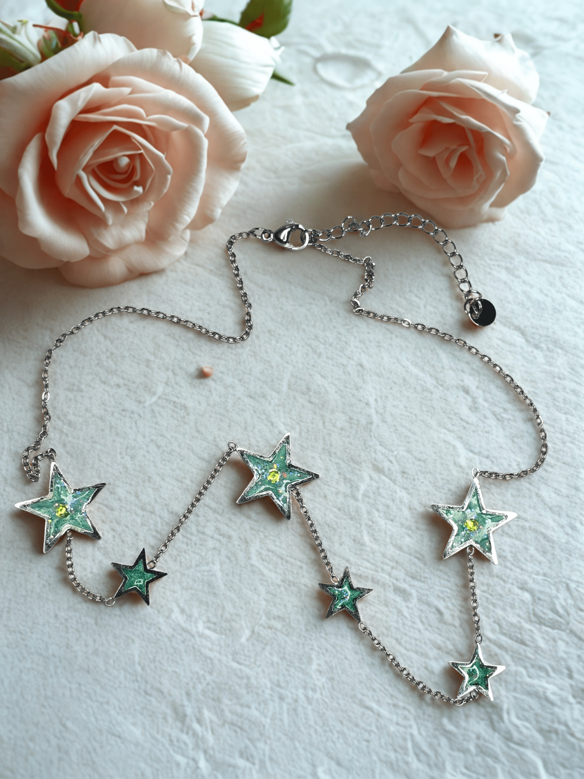 Chaque collier Univers Étoilé vert pailleté est conçu avec un fond en résine pailletée.